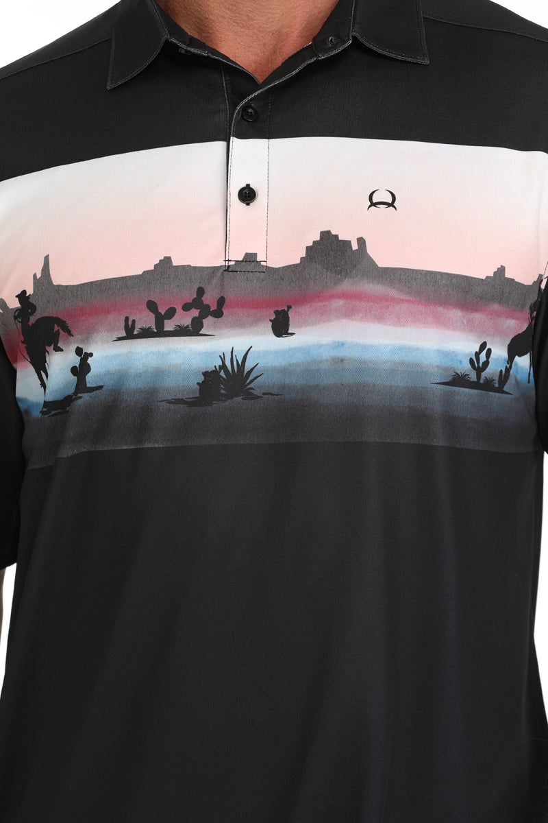Add character to your spring look by wearing this handsome black polo with a view. Its printed poly-spandex construction features the classic polo look with a logo heat transfer and black buttons. Pair it with new blue jeans for the complete outfit.