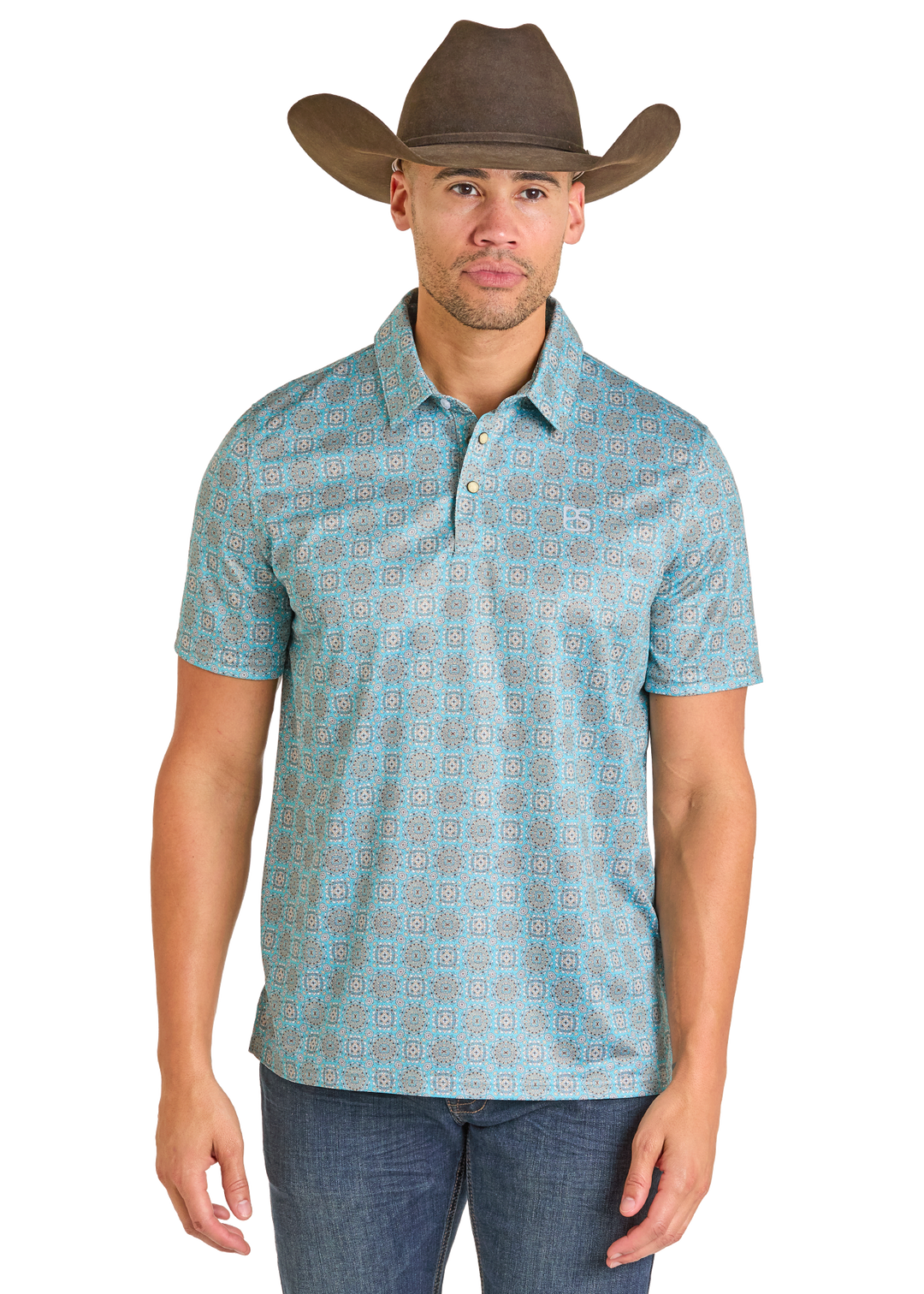 Panhandle Mens Turquoise Print Snap Polo
