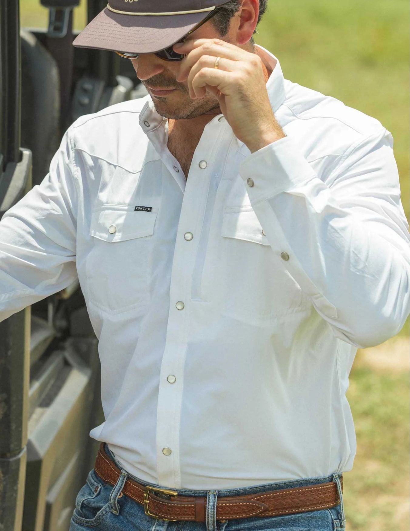 The same breathable, lightweight, and quick-drying fabric you love from Poncho. Now with pearl snaps. Performance meets western.