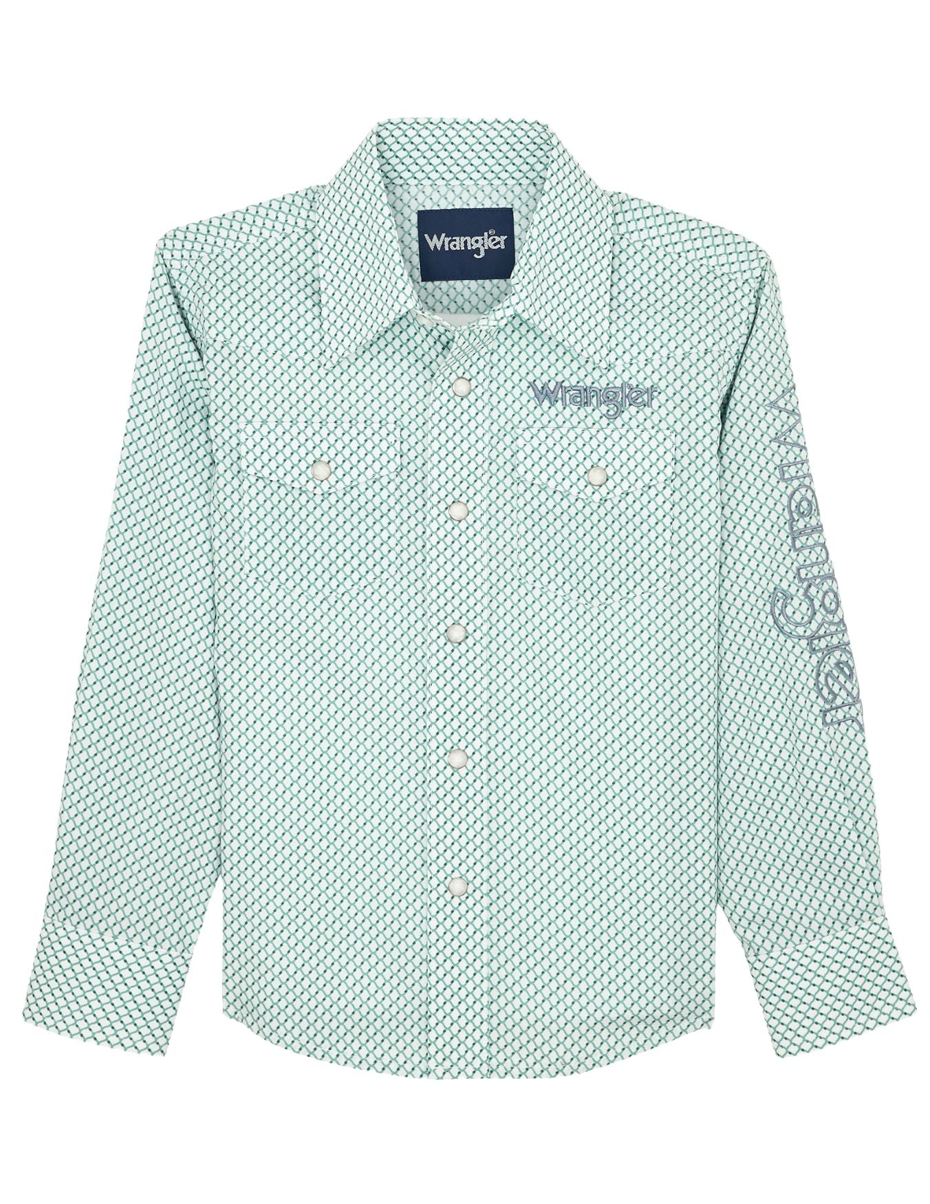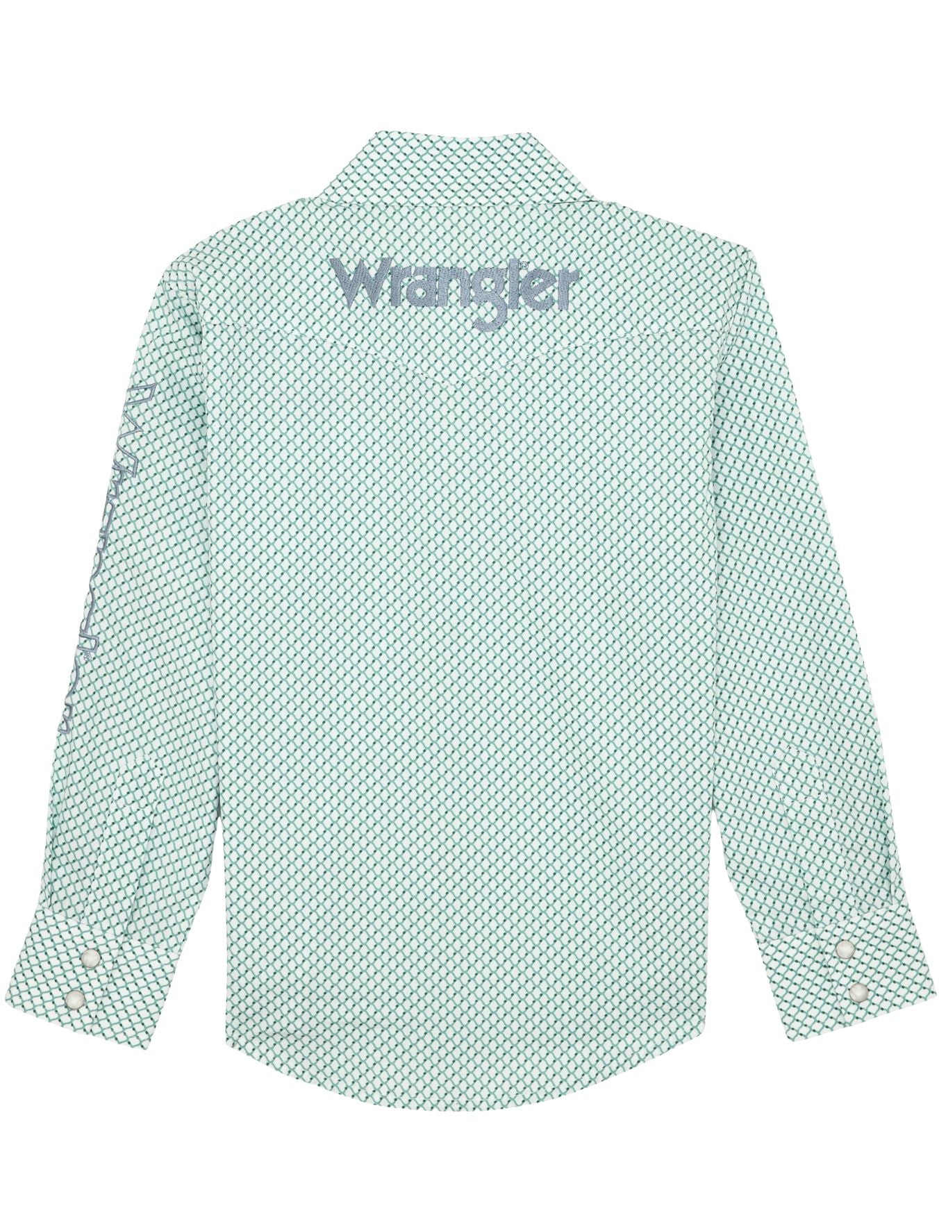 This long sleeve shirt features Western snaps and yokes and two flap snap pockets. Logo embroidery appears across the back yoke and down the sleeves.