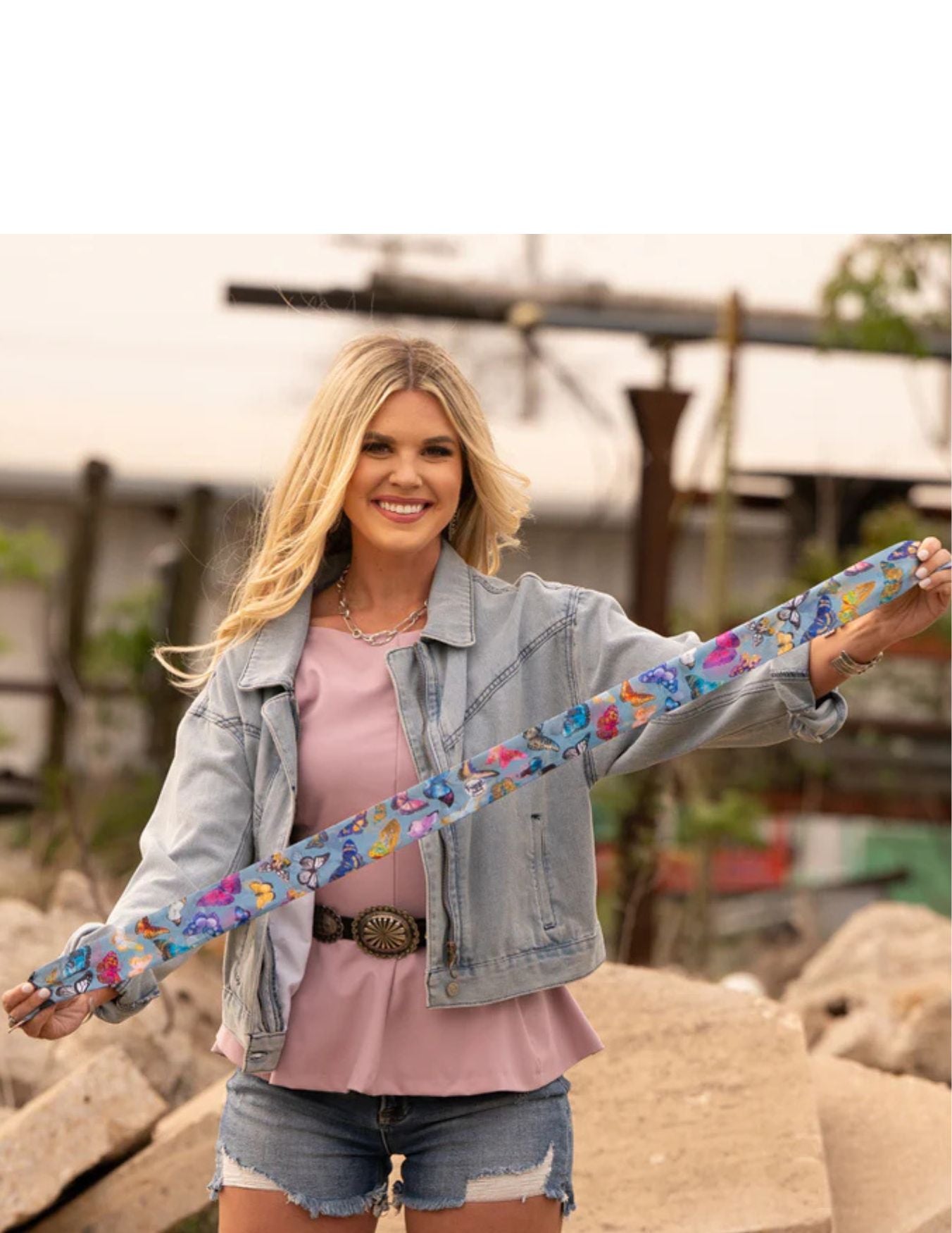 The Butterfly Twilly is a symbol of transformation and freedom—its vibrant hues and chambray backdrop bring a bold, effortless charm to everything from denim to dress coats.
